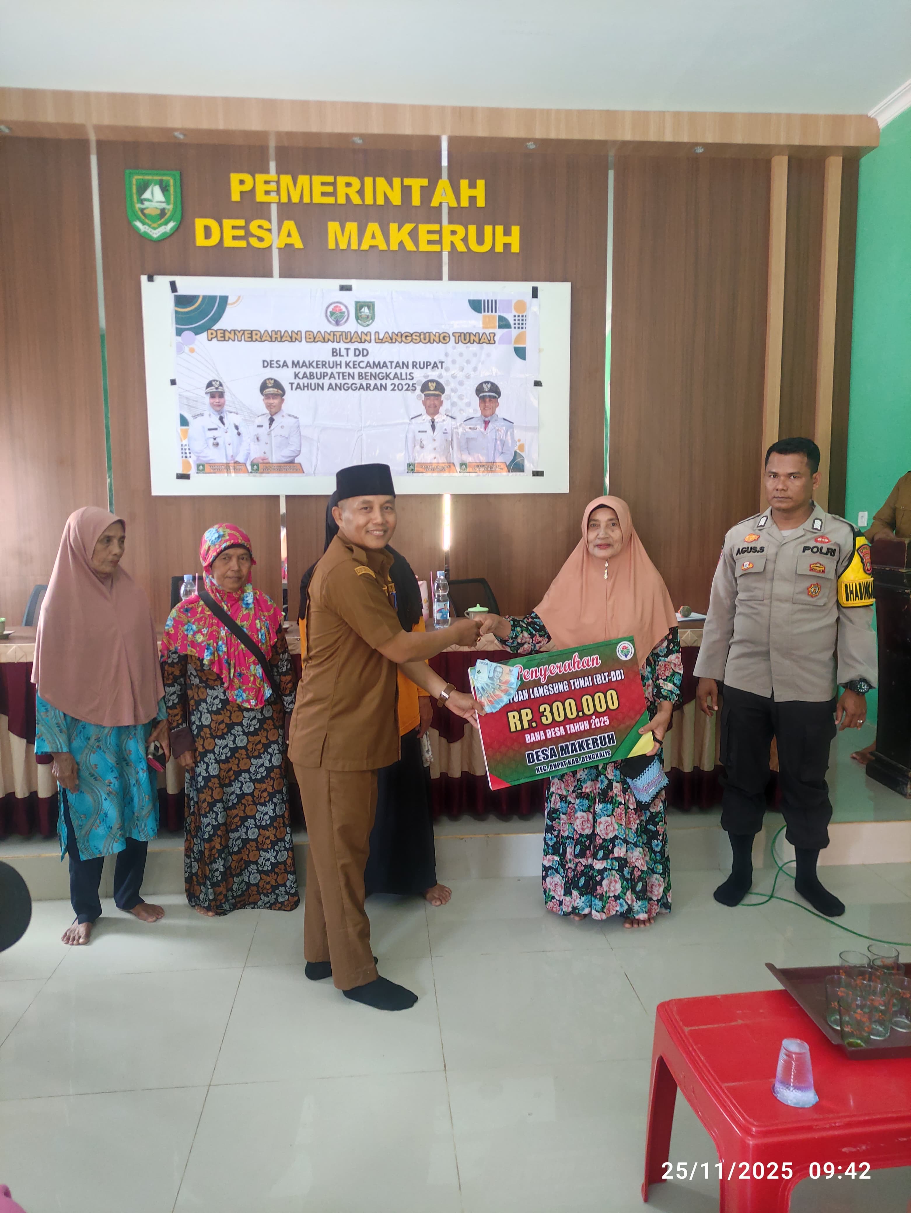 Pemdes Makeruh, [Selasa-25/11/2025] - Pemerintah Desa Makeruh menyerahkan Bantuan Langsung Tunai (BLT) kepada warga desa yang berhak menerima. Bantuan ini diberikan untuk 3 bulan, dengan nilai Rp 300.000 per bulan, sehingga total bantuan yang diterima adalah Rp 900.000.